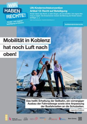 Der Jugendrat hat gemeinsam mit dem Kinder- und Jugendbüro und der JuKuWe zwischen März und Oktober 2023 in der Seilbahn Koblenz Plakate zum Thema Kinderrechte ausgestellt. Die Fotos auf den Plakaten zeigen Kunstwerke aus Grundschulen in Koblenz zum Thema Kinderrechte, Bilder von unserem alljährlichen Projekt "Orte der Kinderrechte", sowie Statements des Jugendrates und anderen Persönlichkeiten Koblenz' zum Thema Kinderrechte, jeweils mit Fotos eines professionellen Fotografen versehen.