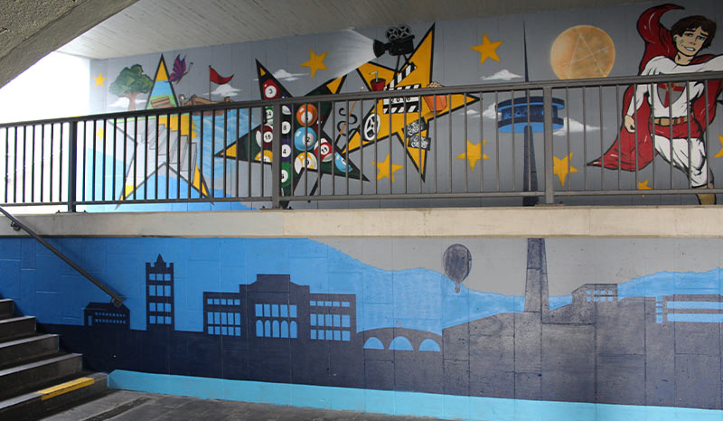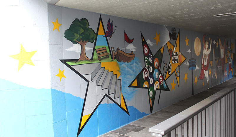 Unterführungen sind manchmal Orte, durch die man nicht so gerne durchgeht. Komische Gerüche, Dunkel und nicht gut einsehbar machen daraus nicht die nettesten Orte. Wir wollen das ein wenig ändern und haben damals getragen durch die AG Sicherheit seit 1999 die Patenschaft für die Unterführung an der Balduinbrücke (zwischen „weißer Höfe“ und dem Weg Richtung Altstadt) übernommen. 2000, 2010 und 2015 haben wir jeweils neue Graffitis mit Unterstützung von unterschiedlichen Graffiti-Künstlern aus der Region angebracht.