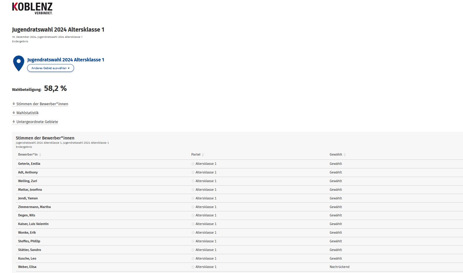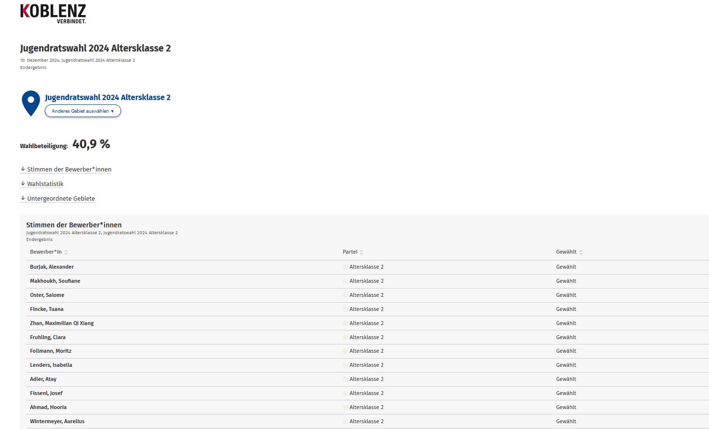 Die Auszählung der Stimmen bei der Jugendratswahl ist nun abgeschlossen! Wir gratulieren allen Gewählten zu ihrem Erfolg und danken allen Wähler:innen und Kandidat:innen für ihre Beteiligung an der Demokratie. Hier ist das offizielle Ergebnis der Wahl, die am 5./6./9./10.12.24 stattfand.